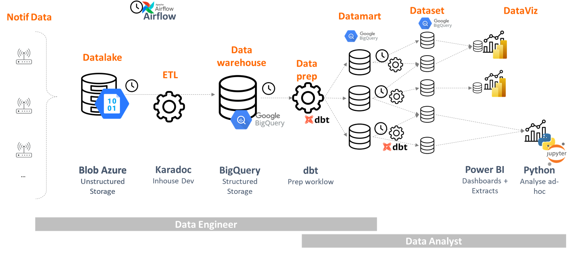 • Implemented a data architecture; Back End : dbt + airflow , Dataviz : Power BI; ad-hoc Analysis : Python - Pandas + Plotly